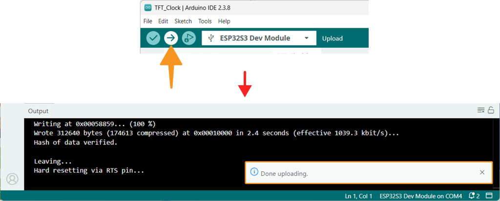 5. Once the code uploads, the clock will start displaying on the TFT screen.