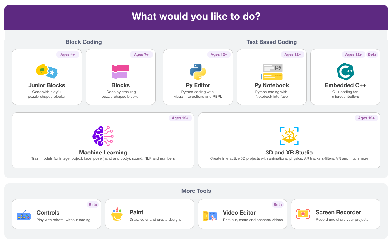 Junior Blocks is designed especially for young children aged 5+ who are just beginning their coding journey. At this age, children learn best through visuals, play, and hands-on activities, not by typing or reading complex text. Instead of writing code, children use large, colorful blocks that they can drag and join together like puzzle pieces to control a character’s actions.