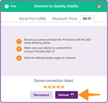 If the connection process stops in between, try reconnecting. Reset the Quarky Intellio and restart the connection process.