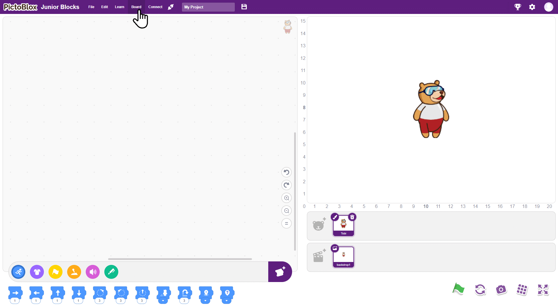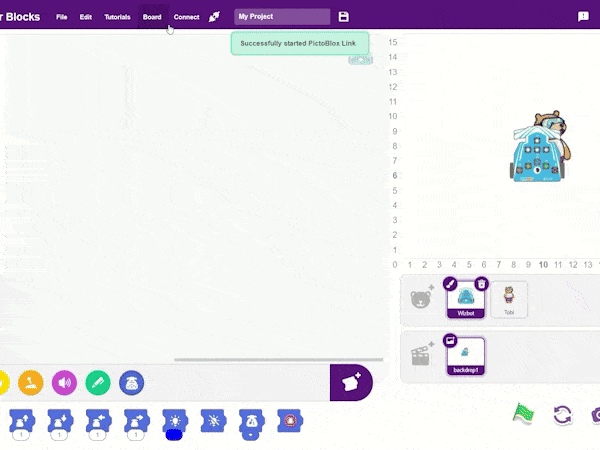 Step 1: Connect Wizbot: Upon launching Junior Blocks, establish a connection with your Wizbot by selecting “Wizbot” as the board and clicking “Connect.”