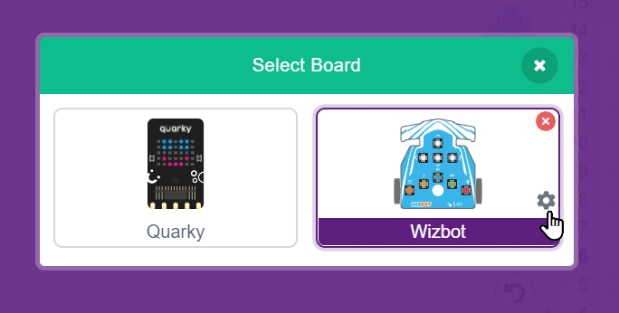 Step 2: Access Calibration Settings: Navigate to the settings icon associated with Wizbot within the Board Tab on the top Navigation bar.
