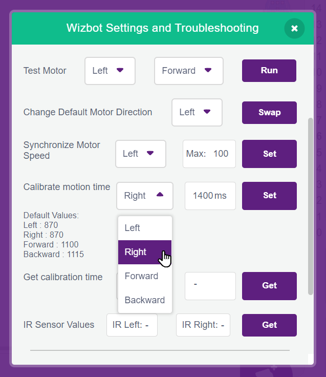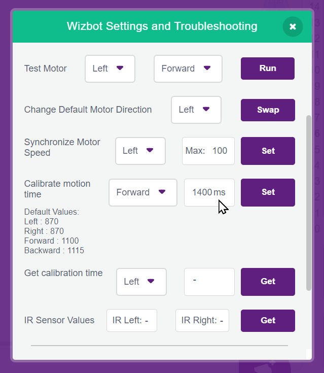 Due to low battery, sometimes Wizbot tends to lose its property of making a perfect forward/reverse/right and left turn. Hence, that is the time calibration is needed.