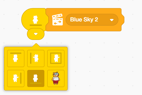 2. Add the ‘Change scene’ block from the controls palette. Make sure the next scene is Blue Sky 2.