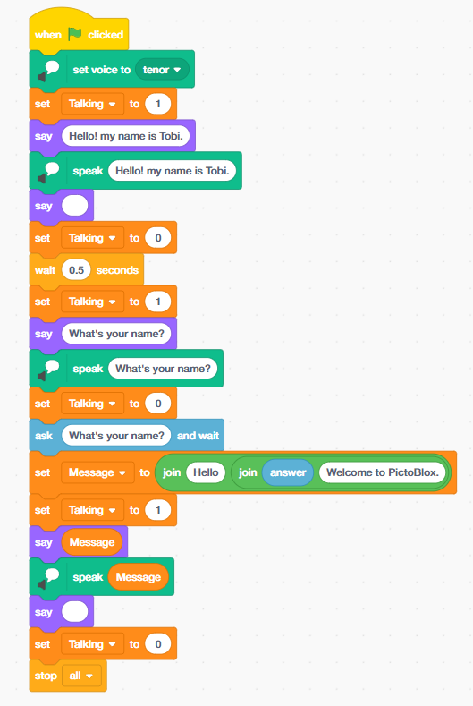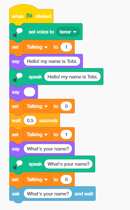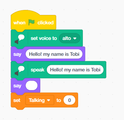 - ‘Set Talking to 1’ from the variable palette again – Tobi is about to speak again.