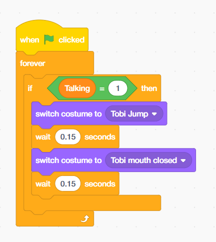 - When ‘Talking’ equals 1, the AI is speaking. Add a ‘switch costume to Tobi block’ (Tobi) from the Looks palette. So Tobi’s mouth opens.