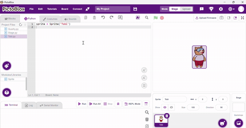 - Open PictoBlox from the onboarding screen and choose the Python coding interface. Select the Tobi.py file from the Project Files section and by default, the syntax will be written in sprite as an object.