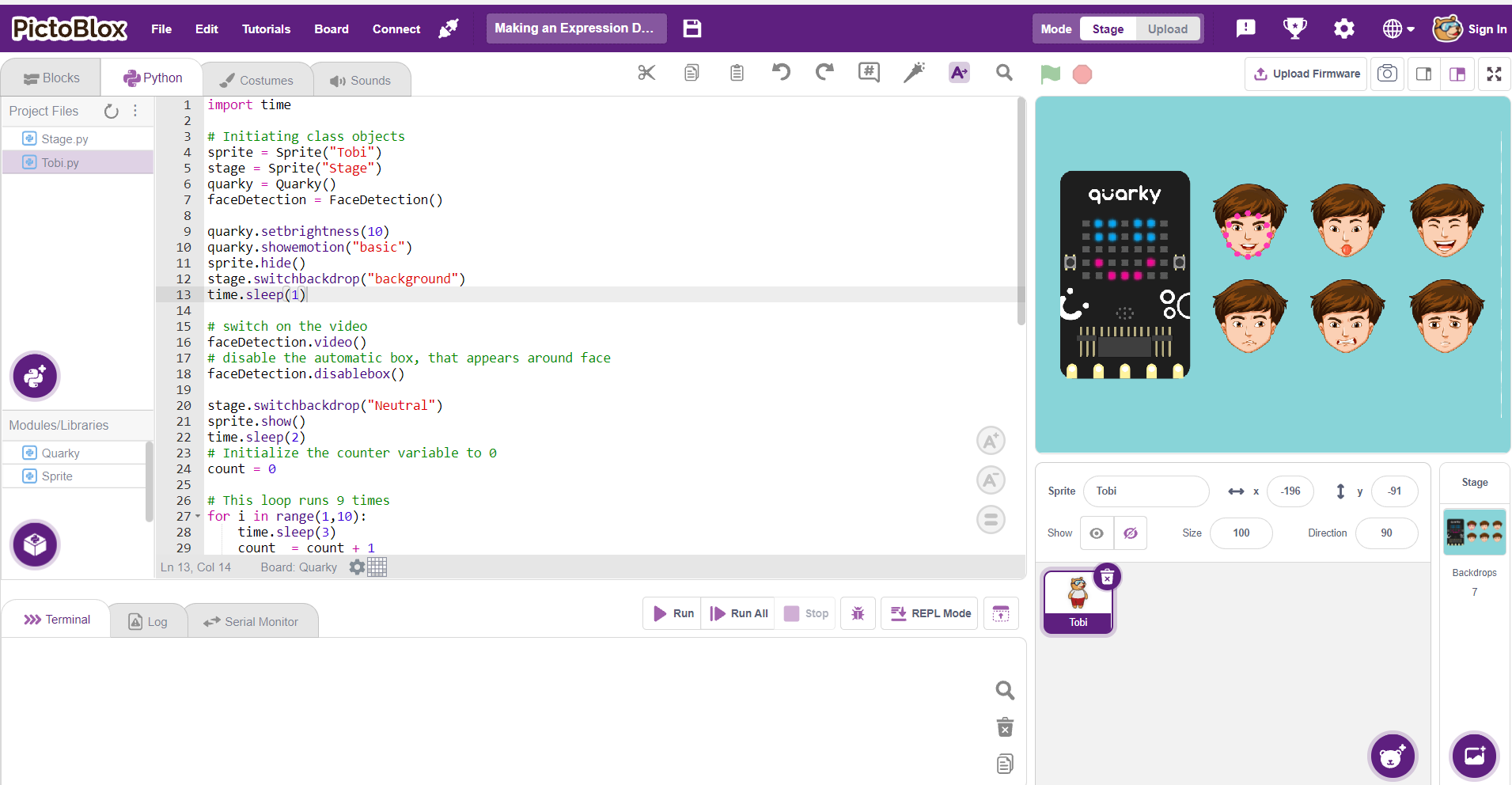 import time # Initiating class objects sprite = Sprite("Tobi") stage = Sprite("Stage") quarky = Quarky() faceDetection = FaceDetection() quarky.setbrightness(10) quarky.showemotion("basic") sprite.hide() stage.switchbackdrop("background") time.sleep(1) # switch on the video faceDetection.video() # disable the automatic box, that appears around face faceDetection.disablebox() stage.switchbackdrop("Neutral") sprite.show() time.sleep(2) # Initialize the counter variable to 0 count = 0 # This loop runs 9 times for i in range(1,10): time.sleep(3) count = count + 1 # Change the backdrop of stage based on loop count if(count == 1): stage.switchbackdrop("Neutral") elif(count == 2): stage.switchbackdrop("Angry") elif(count == 3): stage.switchbackdrop("Surprise") elif(count == 4): stage.switchbackdrop("Sad") elif(count == 5): stage.switchbackdrop("Happy") count = 0 # Detect expressions from the stage (via camera), # make the sprite say the expression detected, and # show the expression detected on stage on quarky LEDs faceDetection.analysestage() sprite.say(faceDetection.expression(1)) if faceDetection.isexpression(1, "happy"): quarky.showemotion("happy") elif faceDetection.isexpression(1, "sad"): quarky.showemotion("crying") elif faceDetection.isexpression(1, "surprised"): quarky.showemotion("surprise") elif faceDetection.isexpression(1, "disgusted"): quarky.showemotion("angry") elif faceDetection.isexpression(1, "neutral"): quarky.showemotion("basic")Conclusion