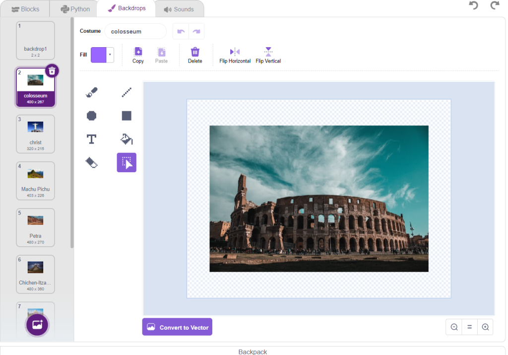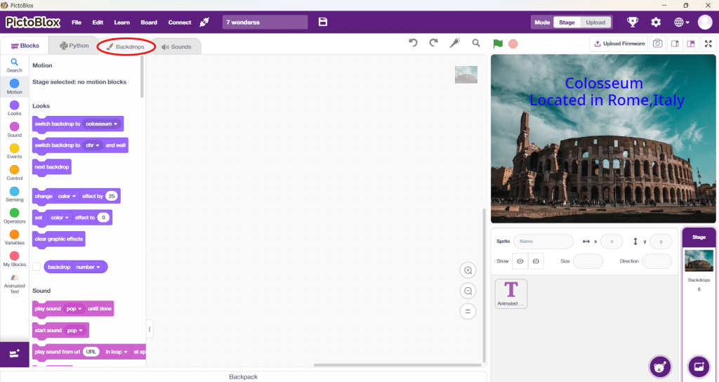 3. Next, we will click on the backdrop and to the Backdrops Tab.  This tab allows users to customize the costumes of Backdrops that have been added to the stage. Here we will set the other six wonders of the worlds as six other costumes for the Backdrop.