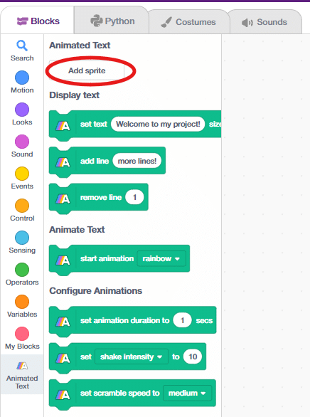 1. In the Blocks environment, select add extension and select Animated Text Extension.