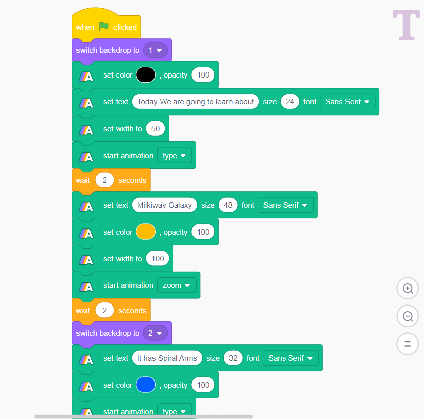 Select the Animated Text Sprite and then you can complete the script by customizing it in a way as shown above. You can also add custom code to your Backdrop.