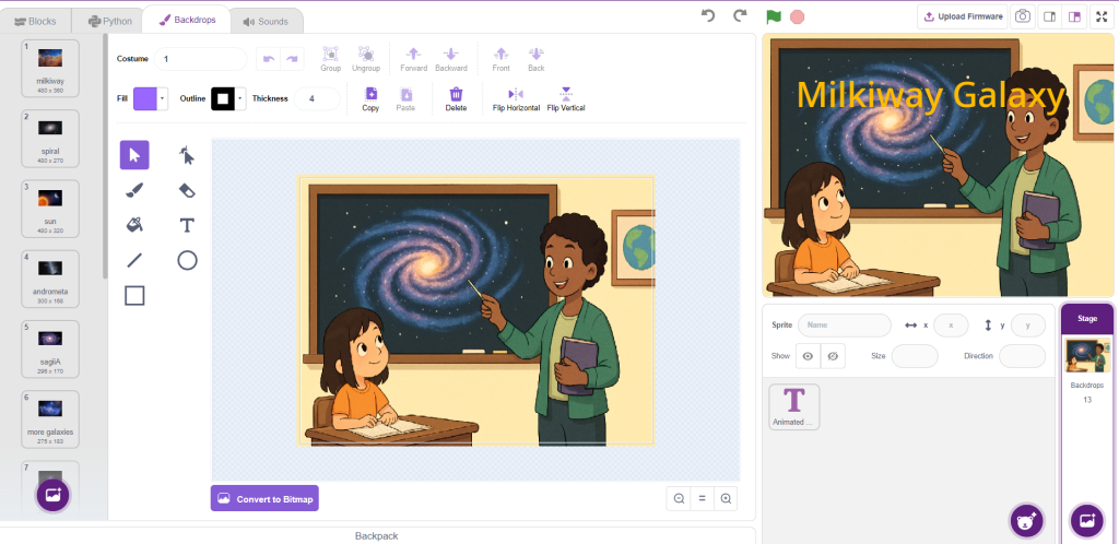 5. After adding all the Backdrops and Sprites, it’s time to write the script using Blocks and Extension.