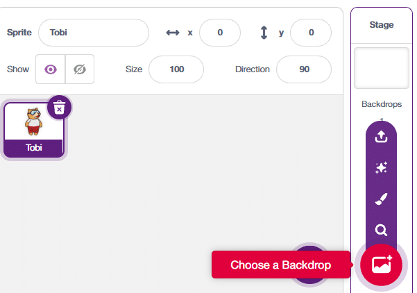 2. First, we’ll incorporate backdrops. These are essentially our background images. You will find the option in the bottom right corner of the screen. We have four options for selecting a backdrop: uploading one from the system, opting for a surprise backdrop, creating a new one using the paint feature, or choosing an existing backdrop from the library.