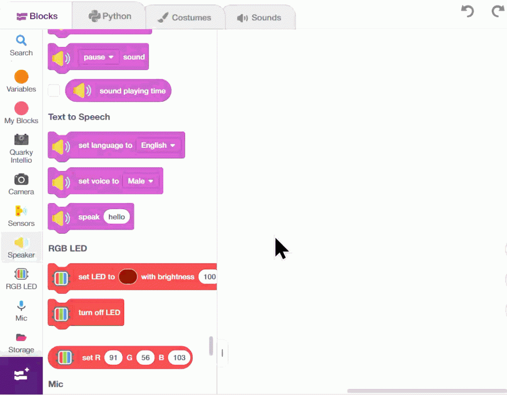- Add the play sound block. Hi, I am Quarky Intellio block from Speaker Palette.