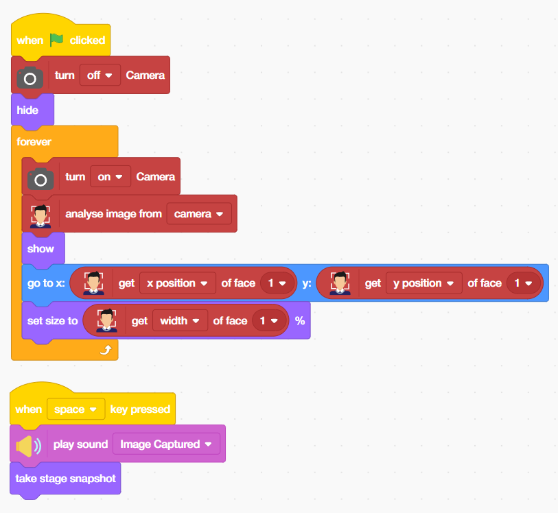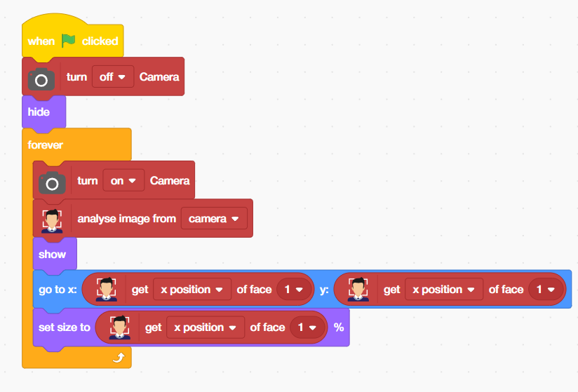 - Add the ‘get x position of face 1’ block from the face detection palette and add it inside the X text box.