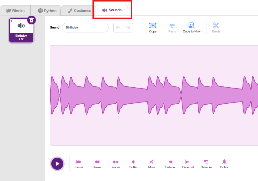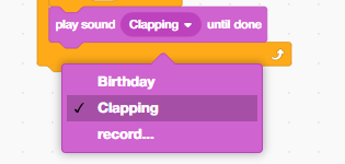 - From the Sound palette, add the “play sound [ ] until done” block and set the sound to “birthday“. This plays the full birthday soundtrack.