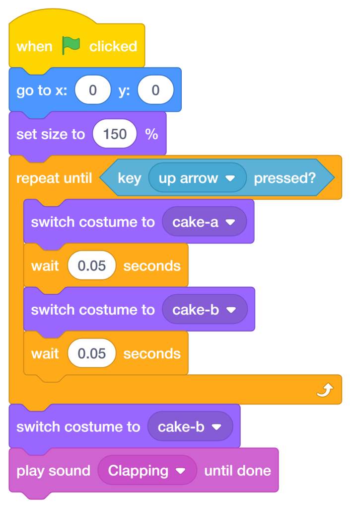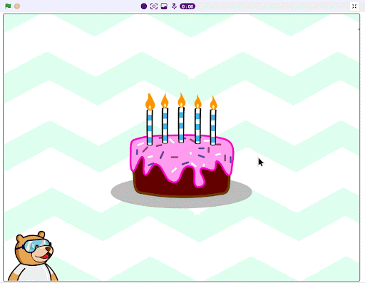 - Add “switch costume to [cake-a]” (candles flicker/blow effect).