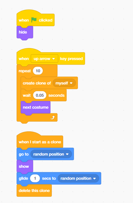- Add the delete this clone from the control palette; it removes the clone from the stage after it finishes gliding.