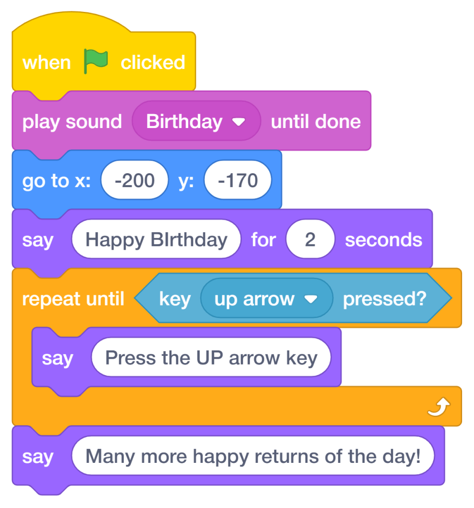 - Add another “say [ ]” block and type “Many more happy returns of the day” outside the repeat-until loop.