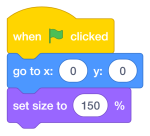 - From the Motion palette, add the “go to x: 0 y: 0” block. This centers the cake sprite on the stage.