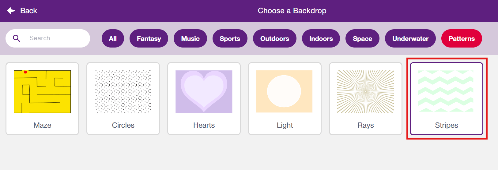Since this card will have some pattern, we need a backdrop that looks like a patterned background. Click on ‘Choose a Backdrop‘ and select the ‘Pattern’ tag in the menu. Choose the Stripes backdrop from the library.